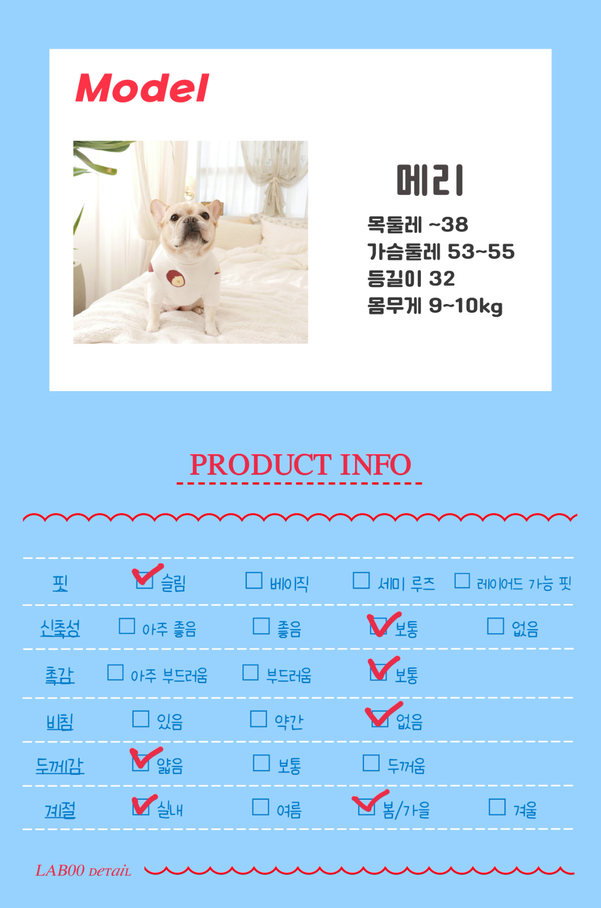 메리 size : 목 38cm 가슴 53~55cm 등길이 32cm 착용사이즈 FM